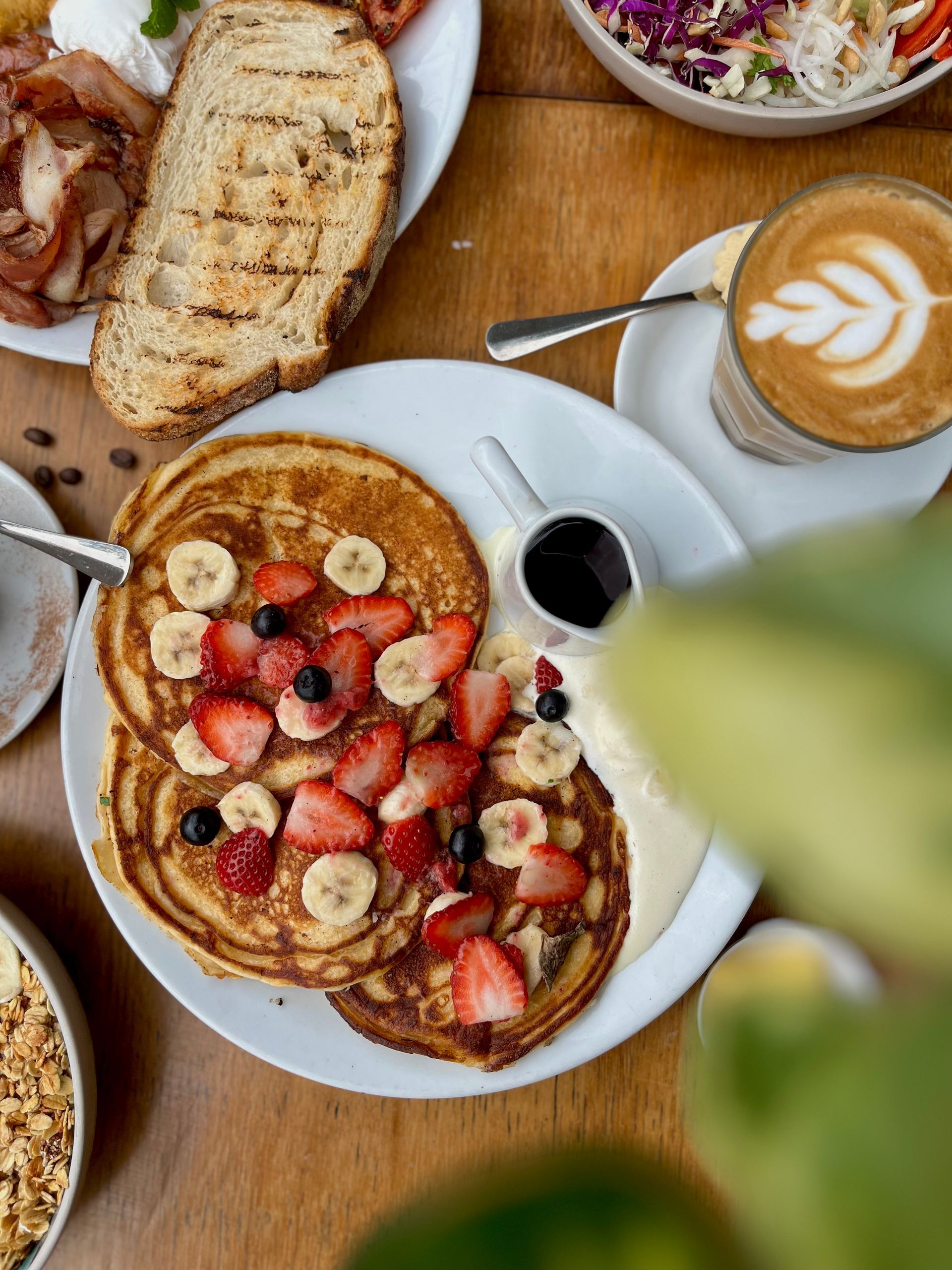 Crumbed Brioche,Caramelised banana, seasonal fruit, maple syrup