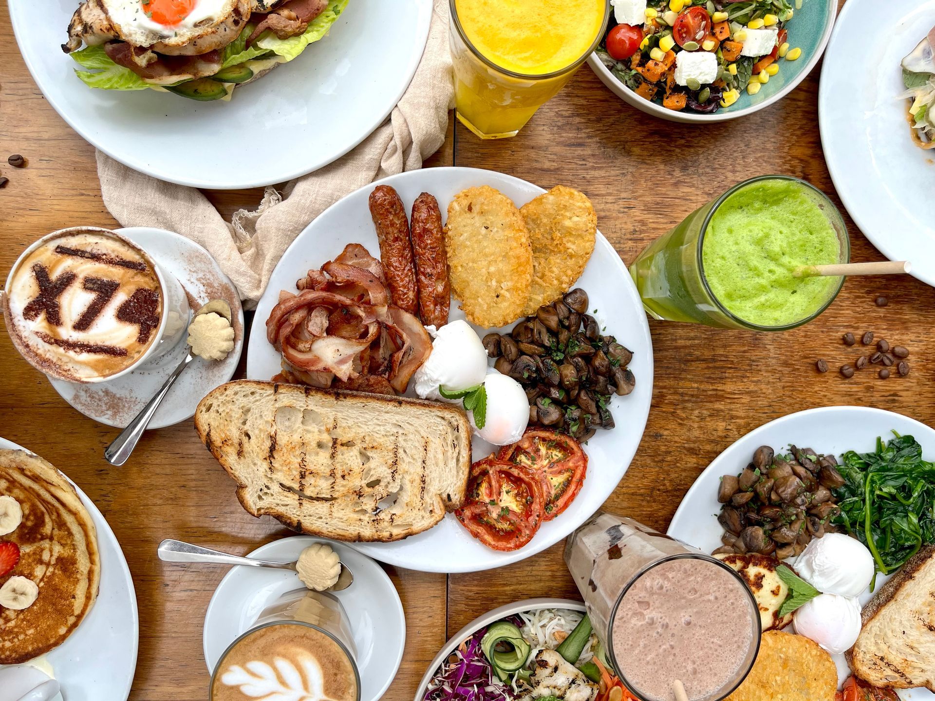 Eggs your way, bacon, pork chipolatas, mushrooms, hash browns, cherry tomatoes on toasted sourdough