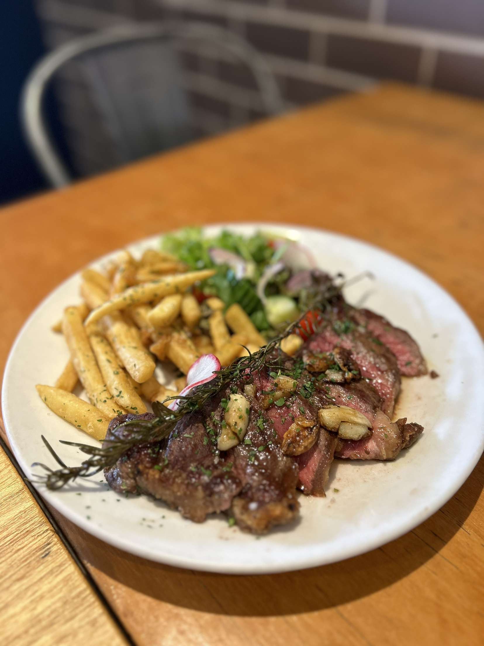 Chips, mixed greens, truss cherry tomatoes, baby cucumber, herbs & your choice of red wine or cafe de paris butter