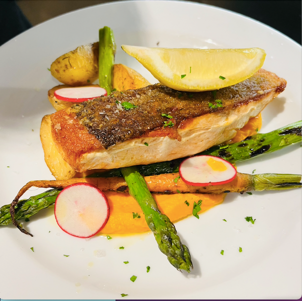 carrot puree, crispy dauphinoise potatoes, seasonal greens, fresh lemon